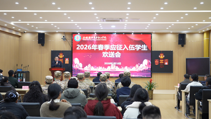 春雨韶光,壮志凌云。3月16日上午,科创馆学术报告厅内座无虚席、气氛热烈,我校2026年春季应征入伍学生欢送会在此隆重举行。分管校领导,各二级学院院长、党支部书记、相关辅导员,入伍学生及家长代表,在校学生代表等近150人参加欢送会。肥西县高店镇人武部领导应邀出席,并带来4名即将入伍的青年代表共同见证这一光荣时刻。欢送会由学生处处长韩双喜主持。
